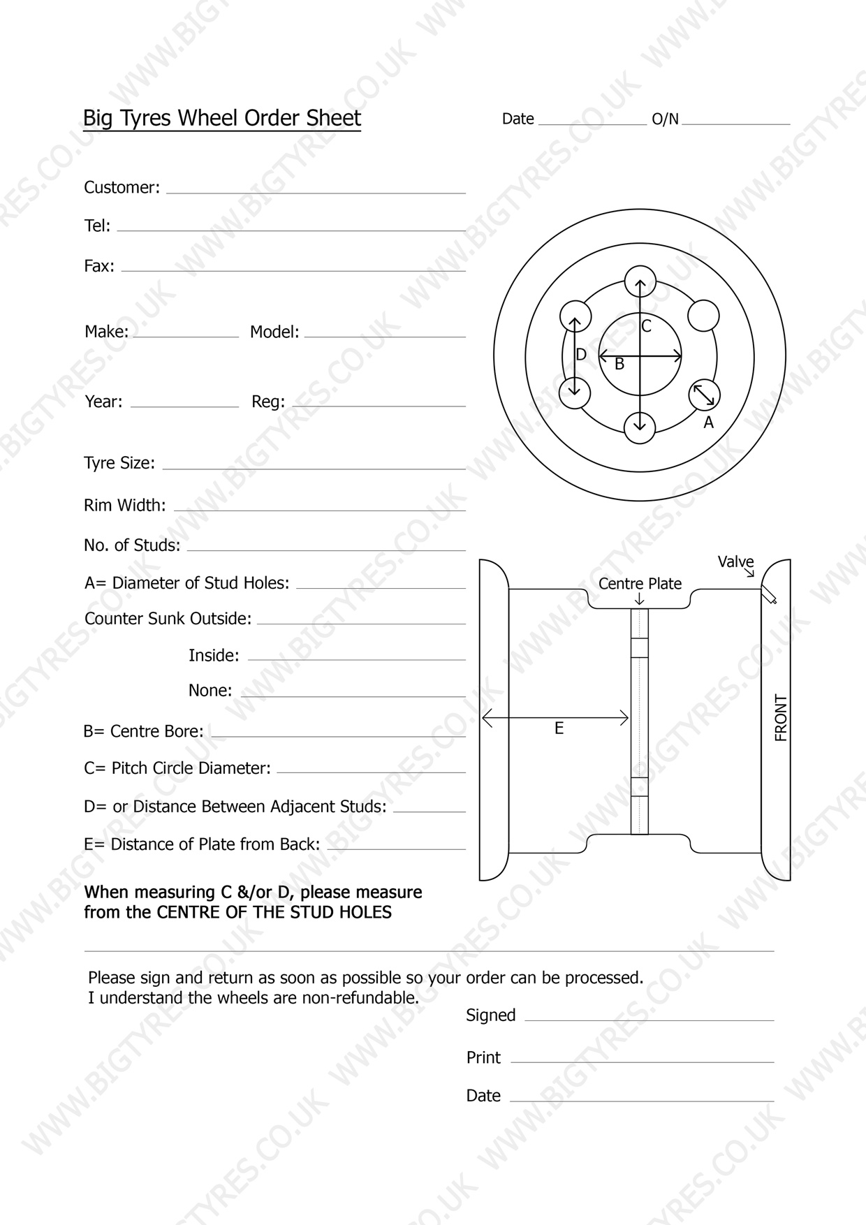 To pass us your information please fill in the form below and click 'Submit'. Once received we will contact you with a quote and lead time to supply your wheel rims. This form is also available to Download in PDF Format or Download in JPG Format if you wish to print it out.