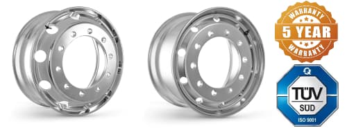 Alloy truck & bus wheels rims are popular due their aesthetic apperance and because they are up to 50% lighter than their steel counterparts. The reduced weight results in reduced vehicle fuel consumption and in reduced tyre wear, ultimately saving the user money in the longer term. Alternatively the weight reduction can allow for an increased payload on the chassis, if so desired. We offer high-quality forged aluminium wheels available in one of three finishes:
